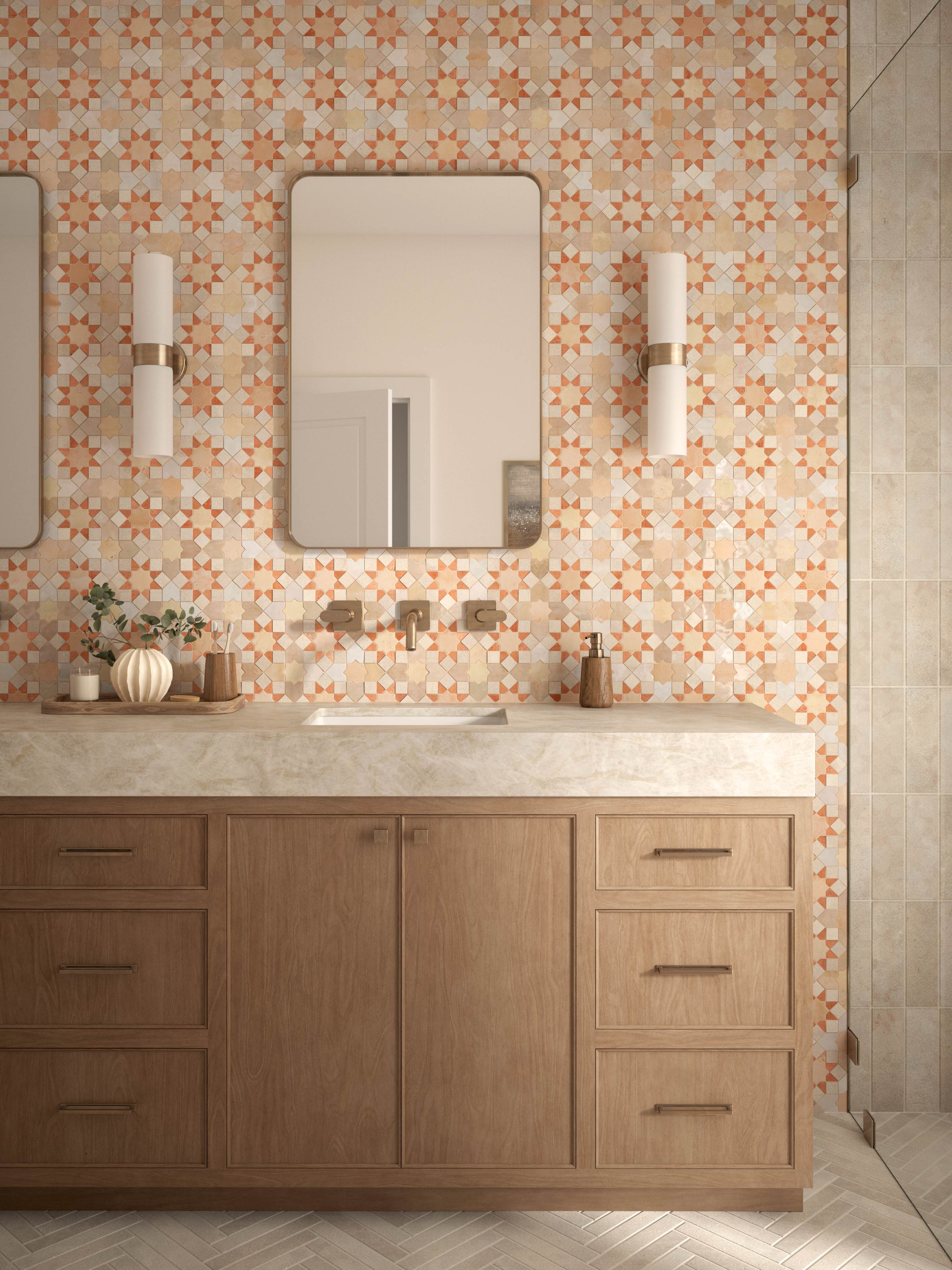 This master bathroom—featuring a spacious walk-in shower—has been thoughtfully designed as a sanctuary of rejuvenation, warmth, and elevated style. The feature wall showcases a stunning handcrafted mosaic tile pattern that pays homage to centuries of Mediterranean tile design. Its interlocking star motif draws influence from the artistic traditions of Morocco, Italy, Spain, and France, capturing the soulful geometry found throughout historic North African and European architecture.At the heart of this mosaic is the spirit of the Mélange tile collection, which blends authentic Zellige tile, natural limestone, and handcrafted terracotta mosaics. Each material contributes its own texture and personality—shimmering glazes, matte stone surfaces, warm earthy tones—creating a rich, layered tapestry that feels both timeless and fresh.