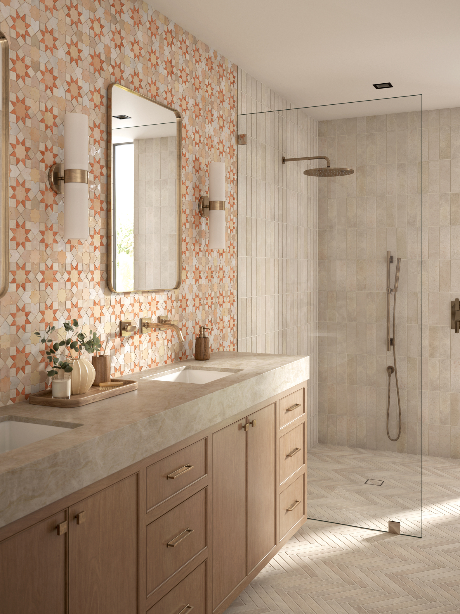 This master bathroom—featuring a spacious walk-in shower—has been thoughtfully designed as a sanctuary of rejuvenation, warmth, and elevated style. The feature wall showcases a stunning handcrafted mosaic tile pattern that pays homage to centuries of Mediterranean tile design. Its interlocking star motif draws influence from the artistic traditions of Morocco, Italy, Spain, and France, capturing the soulful geometry found throughout historic North African and European architecture.At the heart of this mosaic is the spirit of the Mélange tile collection, which blends authentic Zellige tile, natural limestone, and handcrafted terracotta mosaics. Each material contributes its own texture and personality—shimmering glazes, matte stone surfaces, warm earthy tones—creating a rich, layered tapestry that feels both timeless and fresh.